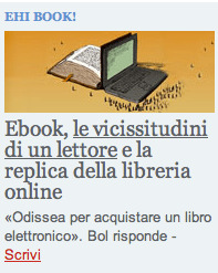 Segnaliamo un articolo pubblicato sul blog Ehi book! di Corriere.it che racconta le “vicissitudini” (sic!) di Paolo Rastelli, caporedattore del Corriere, per poter usufruire di un ebook acquistato su Bol.it