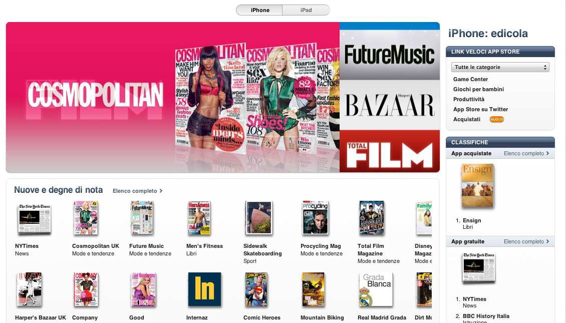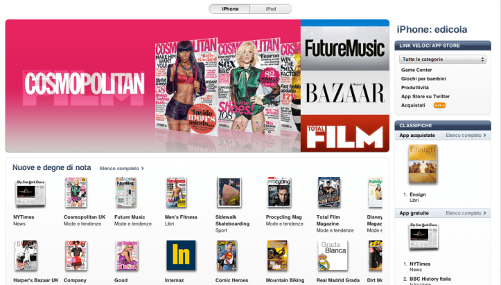 Debutta su iTunes Store il nuovo servizio “Edicola”: in pratica da oggi c’è una nuova sezione dedicata ad accogliere riviste e periodici che possono essere acquistati singolarmente, in abbonamento e alcuni anche gratuitamente.