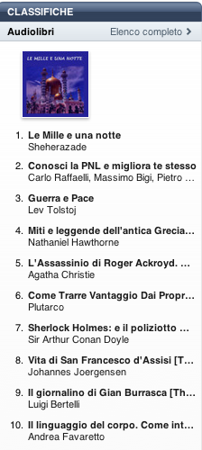 Pubblichiamo la classifica degli audiolibri più venduti su iTunes Store nella settimana dal 2 al 9 gennaio 2012. I dati sono quelli pubblicati ufficialmente da Apple nella pagina iTunes Store Top 10 Audiobooks.