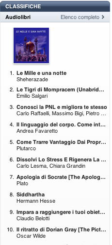 Pubblichiamo la classifica degli audiolibri più venduti su iTunes Store nella settimana dal 9 al 16 gennaio 2012. I dati sono quelli pubblicati ufficialmente da Apple nella pagina iTunes Store Top 10 Audiobooks.