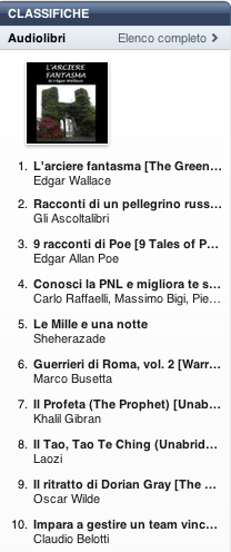 Pubblichiamo la classifica degli audiolibri più venduti su iTunes Store nella settimana dal 7 al 13 febbraio 2012. I dati sono quelli pubblicati ufficialmente da Apple nella pagina iTunes Store Top 10 Audiobooks.