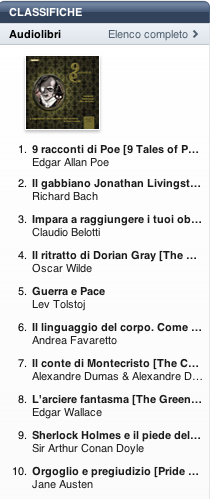Pubblichiamo la classifica degli audiolibri più venduti su iTunes Store nella settimana dal 13 al 20 febbraio 2012. I dati sono quelli pubblicati ufficialmente da Apple nella pagina iTunes Store Top 10 Audiobooks.
