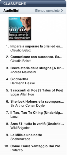 Pubblichiamo la classifica degli audiolibri più venduti su iTunes Store nella settimana dal 19 al 26 marzo 2012. I dati sono quelli pubblicati ufficialmente da Apple nella pagina iTunes Store Top 10 Audiobooks.
