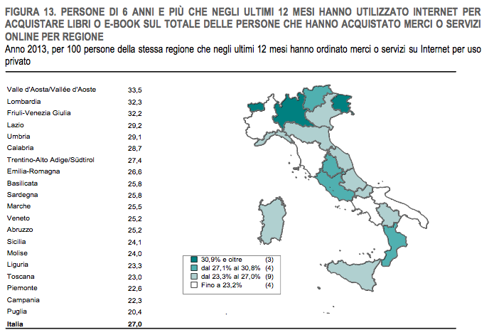 In Italia nel 2013 5 milioni 224 mila persone di 6 anni e più hanno dichiarato di avere letto o scaricato libri online o e-book. Stiamo parlando del 9.1% della popolazione di 6 anni e più e del 17.3% delle persone che hanno utilizzato internet negli ultimi tre mesi. Peccato che non venga differenziata la percentuale di chi ha acquistato libri online e di chi, invece, ha acquistato ebook.
