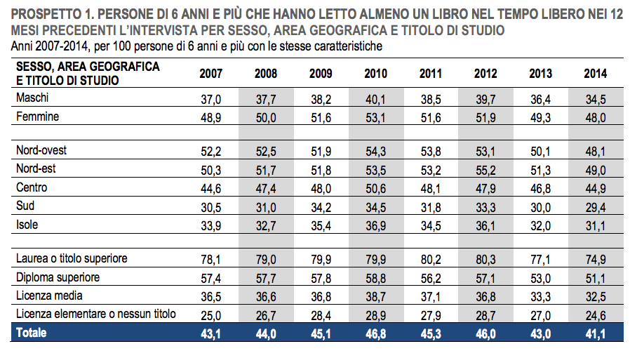 È stata pubblicata oggi dall’ISTAT l’indagine “La produzione e la lettura di libri in Italia” per il 2014: i lettori di libri in Italia scendono al 41,4%