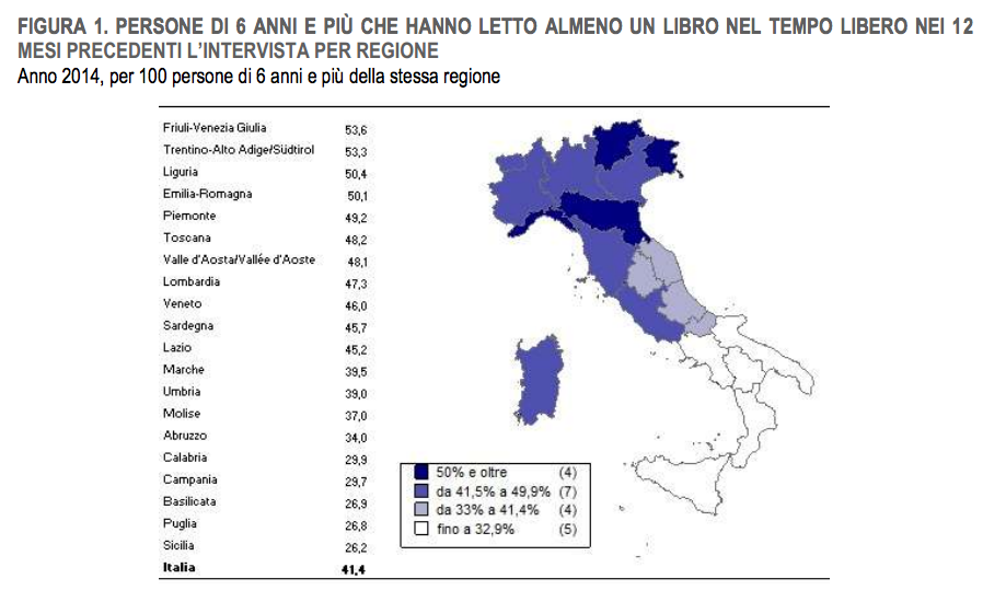 Nelle città si legge di più, con una quota di lettori che arriva al 50,8%, quota che crolla al 37,2% nelle città con meno di 2.000 abitanti. Il Sud è la zona del Paese in cui si legge meno in assoluto, con il 29,4% degli abitanti che ha letto almeno un libro nel corso del 2014 (31,1% nelle isole).