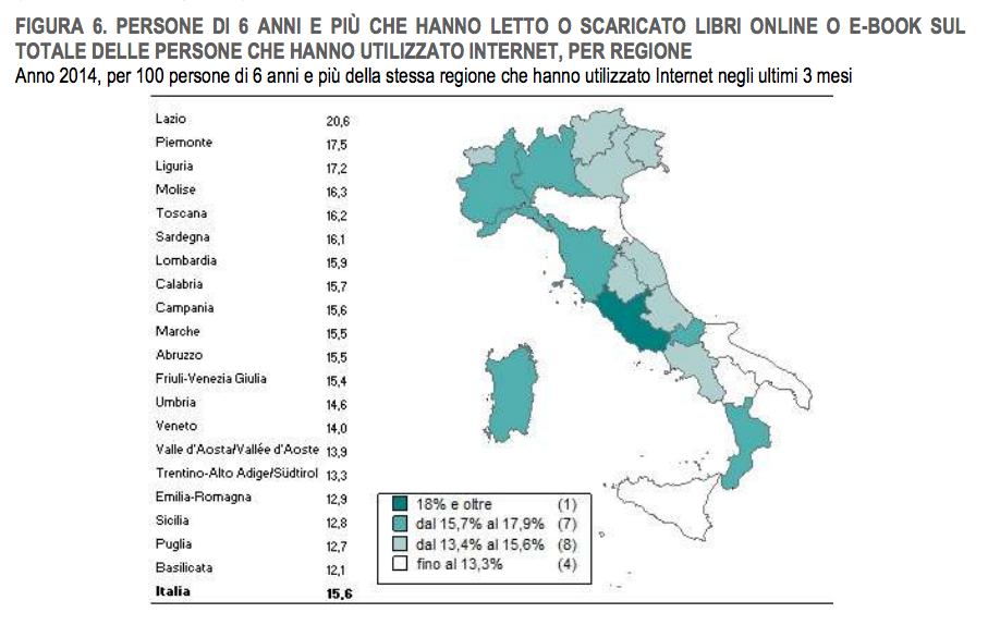 E se non esiste il mercato del cartaceo figuriamoci quello del digitale. Sono infatti circa 5 milioni gli italiani con più di 6 anni che hanno dichiarato di aver letto o scaricato libri online o ebook negli ultimi tre mesi del 2014, per dato complessivo dell’8.7%, cifra che aumenta al 15,6% delle persone che utilizzano internet negli ultimi mesi.