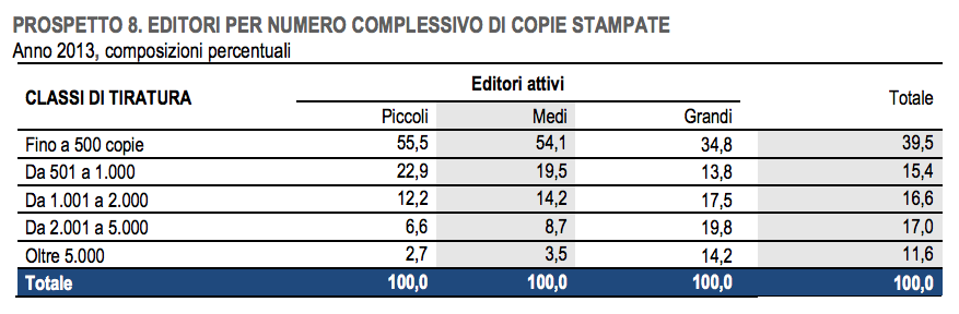 Nonostante la crisi infine rispetto al 2013 aumentano sia i titoli pubblicati (+6.3%) che le copie stampate (+2.5%). E questo dato si collega direttamente alla tirature delle copie stampate dagli editori italiani: il 39,5% dei libri ha una tiratura inferiore alle 500 copie. Roba da spararsi.