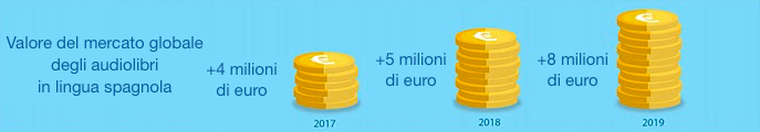 Stando alla ricerca di Dosdoce ci sono tutte le premesse perché il mercato dell’audiolibro in spagnolo diventi davvero interessante: nel 2019 le vendite in tutto di audiolibri in lingua spagnola in tutto il mondo dovrebbero superare gli 8 milioni di euro, con un enorme balzo in avanti rispetto ai 5 milioni di euro fatturati nel 2018.