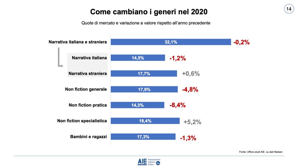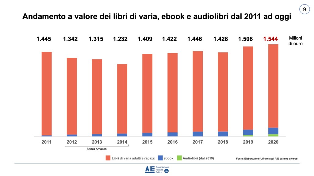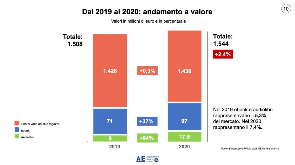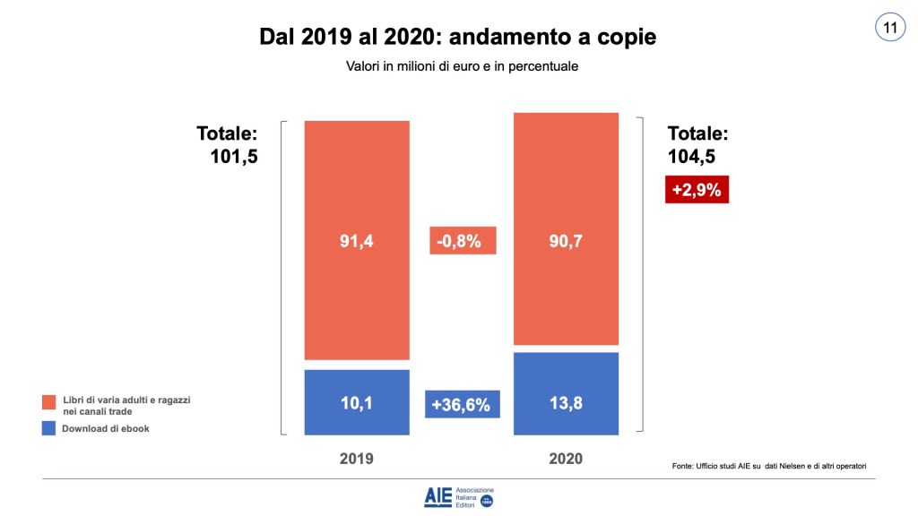Il digitale, grazie a eBook e audiolibri, oggi vale il 7.4% delle vendite complessive del comparto varia. Per quanto riguarda le copie cala il mercato del cartaceo che a fine 2020 registra un -0,8%, compensato però dal +36% in termini di copie fatto registrare dagli eBook.