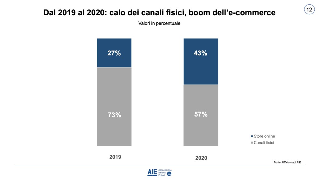 Cresce sempre di più il peso dell’eCommerce con le librerie che cedono il passo agli store online. L’eCommerce nel 2020 è arrivato al 43% del mercato (era il 27% nel 2019), ma ovviamente con le librerie chiuse per diversi mesi era un dato inevitabile. Preoccupa il predominio pressoché assoluto di Amazon che ormai è il player di riferimento per gli acquisti di libri (e non solo) online.