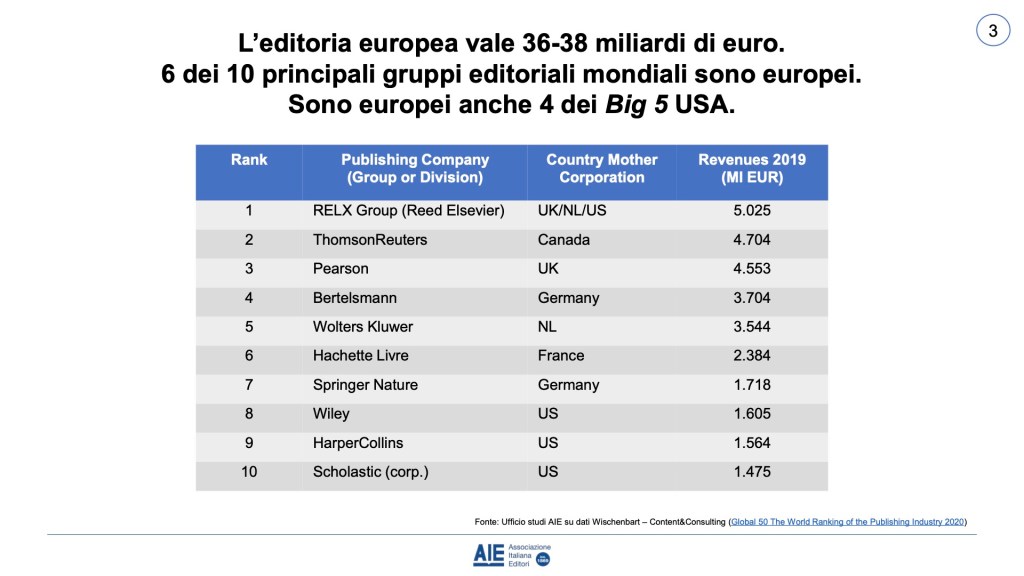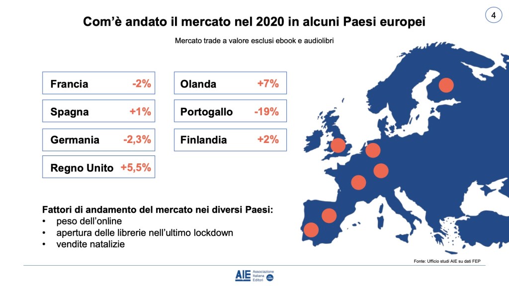 Il mercato del libro in Italia vale complessivamente circa 3 miliardi di euro e si conferma la più grande industria culturale italiana. Francia e Germania perdono rispettivamente il 2% e 2.3% in questo difficilissimo 2020, mentre la Spagna cresce dell’1%, così come crescono Regno Unito (+5,5%), Olanda (+7%) e Finlandia (+2%)