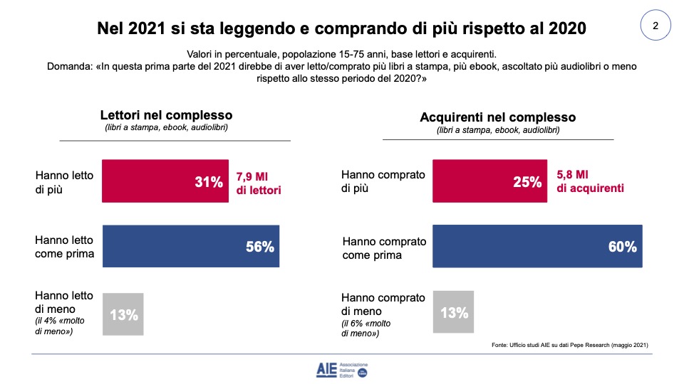 L’applicazione 18App è stata sicuramente uno degli strumenti più utili per raggiungere questi risultati: nei primi due mesi del 2021, infatti, sono stati spesi 75 milioni di euro in più rispetto all’anno precedente. Sono cambiate anche le abitudini dei lettori: il 31% dei lettori ha dichiarato di leggere più di prima, mentre il 25% degli acquirenti ha dichiarato di aver aumentqato gli acquisti. Soltanto il 13% ha dichiarato di leggere o acquistare meno.