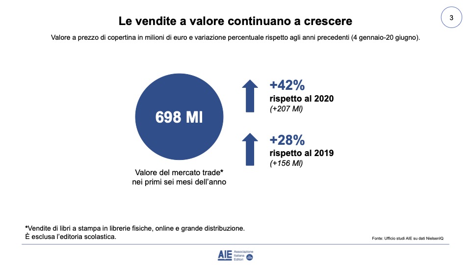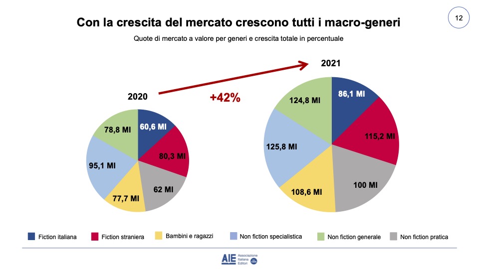 Anche dal punto di vista del fatturato i numeri sono enormemente positivi con 207 milioni di euro in più rispetto al 2020 (+42%) e 156 milioni in più rispetto al 2019 (+28%). Il valore complessivo del mercato librario arriva a sfiorare i 700 milioni di euro, fermandosi a 698milioni di euro.