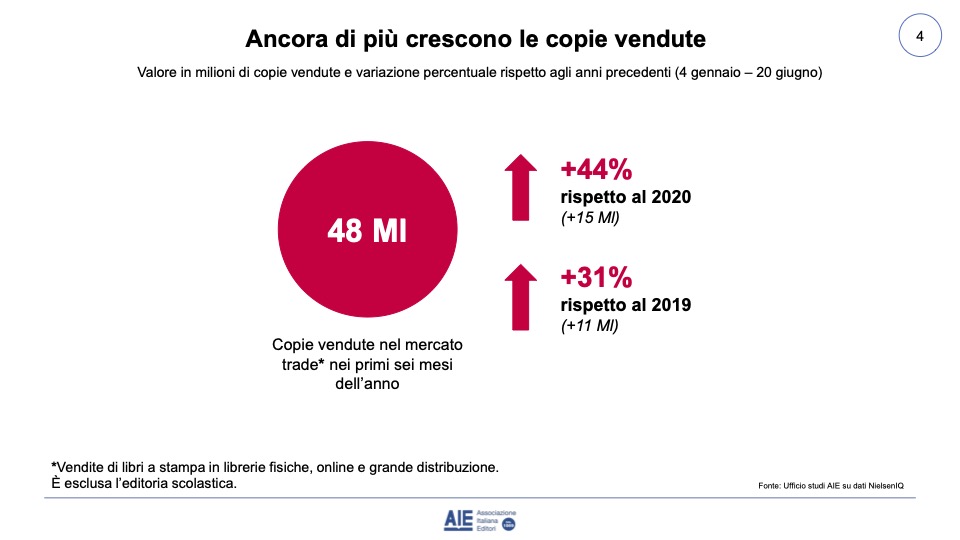 Complessivamente da gennaio a giugno 2021 sono stati vendute 15 milioni di copie di libri stampati in più rispetto al 2020, con un aumento record del 44%. Il dato è ancora più significativo se si fa un paragone con il 2019, dato che il il primo semestre 2020 è stato fortemente condizionato dalle restrizioni imposte a causa della pandemia. Rispetto allo stesso periodo nel 2019, infatti, l’aumento è del 31% (11 milioni di copie in più).