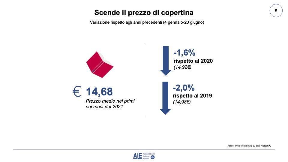 Interessante notare come non siano soltanto i bestseller a muovere il mercato: i 50 titoli più venduti pesano sul totale del mercato solo per il 7,7% a valore di copertina e per il 6,9% a prezzo di copertina. Il prezzo medio di copertina si attesta a 14,68 euro ed è in calo dell’1,6% rispetto al 2020 e del 2% rispetto al 2019.