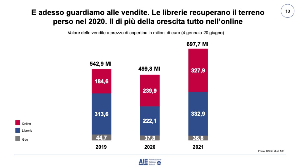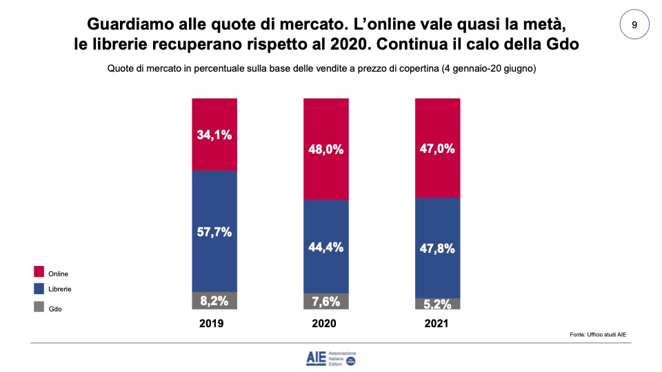 L’online è diventato comunque ormai il canale di riferimento per i lettori italiani: se nel primo semestre 2019 la quota di mercato delle librerie online era di 184,6 milioni di euro, nello stesso periodo del 2021 si è arrivati a 327,9 milioni di euro di fatturato (il 47% del mercato). Sembra essere invece in crisi la GDO.