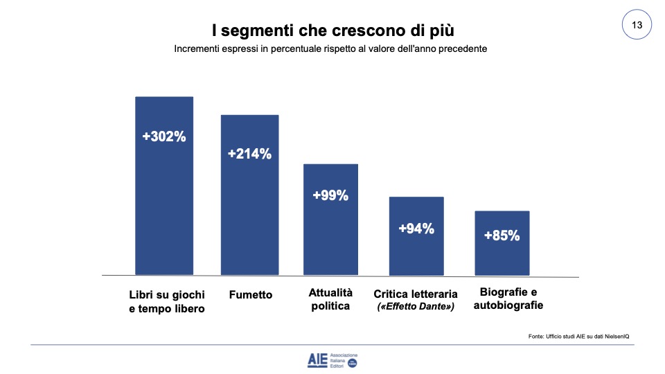 Tutti i vari generi hanno fatto registrare una crescita uniforme, con alcuni picchi relativi ai libri su giochi e tempo libro che hanno addirittura aumentato del 302% le vendite. Benissimo anche i fumetti (+214), l’attualità politica (+99%) la critica letteraria che grazie all’effetto Dante ha raggiunto un ottimo +94% e le biografie e autobiografie (+85%).