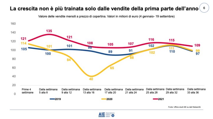 Il prezzo medio di copertina del venduto è infatti in calo e pari a 14,35 euro (-1,9% sul 2020 e -1,7% sul 2019).
