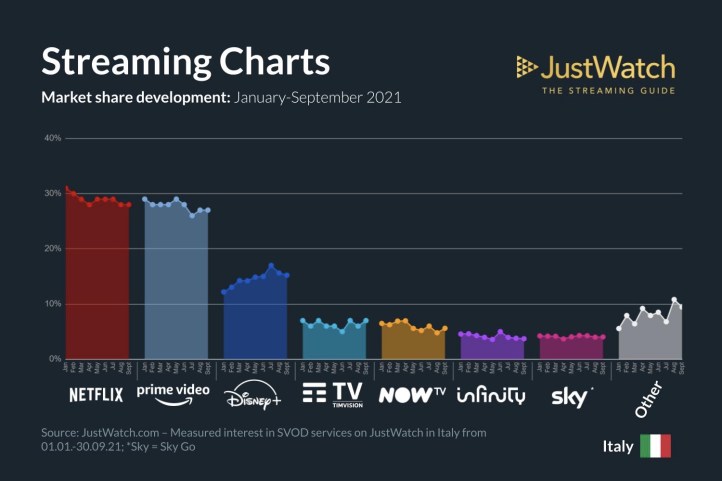 I dati e le infografiche sono stati realizzati da JustWatch, portale dedicato allo streaming internazionale attivo in 60 paesi con più di 20 milioni di utenti mensili.
