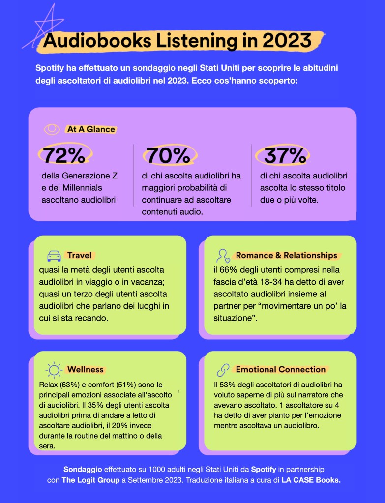 Ci sono anche un po’ di audiolibri in lingua italiana dato che noi di LA CASE Books siamo partner di Spotify e abbiamo inserito una selezione dei nostri audiolibri.